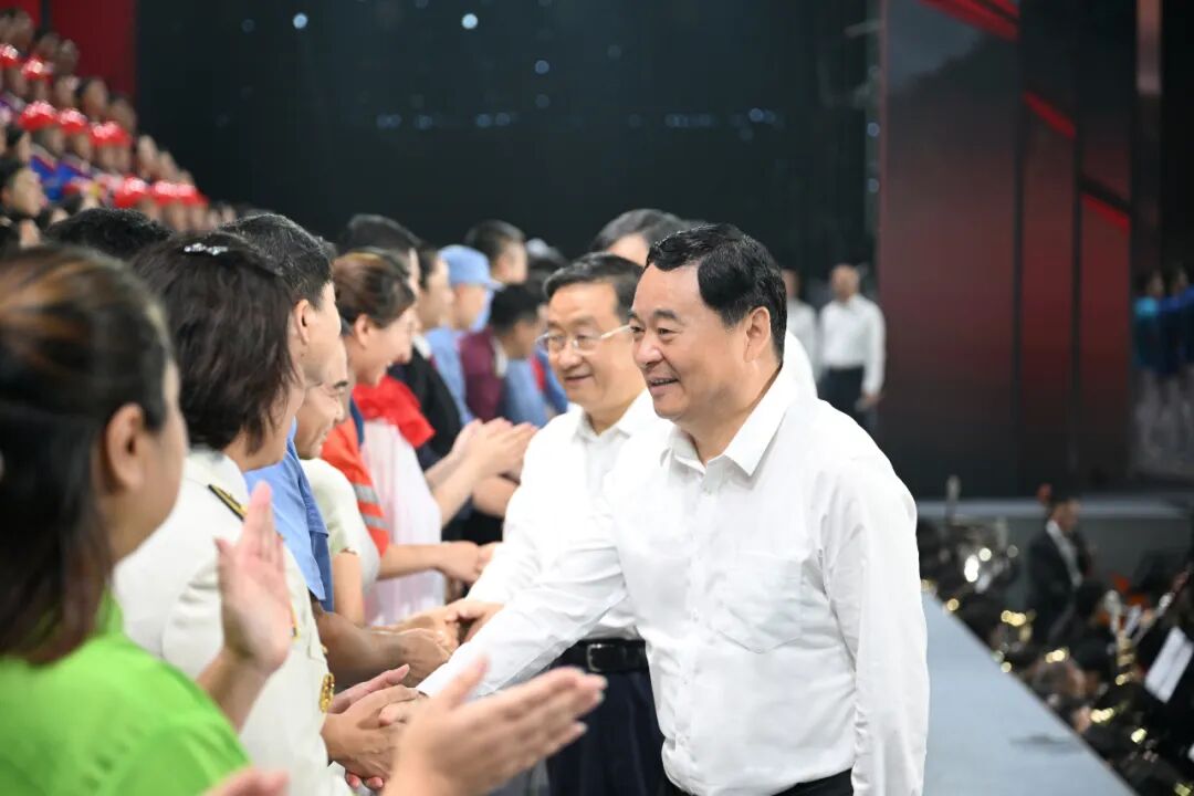 省委书记、省人大常委会主任郝鹏,省委副书记、省长王新伟,省政协主席周波等省领导看望参演人员,与大家亲切握手并合影留念。