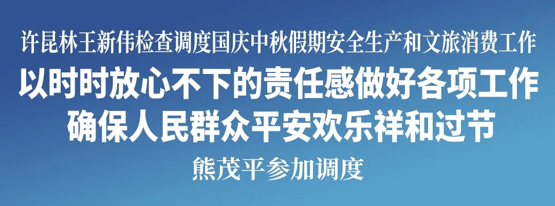 许昆林指出,今年国庆中秋双节叠加,假期时间较长、客流量大,活动密集、风险点多,要提高政治站位,树牢底线思维、极限思维,全力以赴做好稳生产、促消费、保安全各项工作。要压紧压实各方责任,各级党委政府对节日期间各方面情况实行日调度,压实属地管理责任、部门监管责任、企业主体责任,严格执行值班值守制度,把工作任务落实到人头、落实到岗位、落实到“神经末梢”。要扎实做好安全稳定工作,进一步拧紧安全责任链条、落细落实防范措施,紧盯重点领域重点部位重点环节,全力抓好道路交通安全,坚决防范出现长时间、大面积拥堵,抓实消防安全和渔业安全生产,强化社会治安整体防控,坚决防范遏制重特大事故发生。要保障文旅市场平稳有序,完善迎峰措施,做好各项预案,加大市场监管力度,做好精细化、人性化服务,抓住有利契机,打造更多新场景、新体验、新热点,持续提升文旅市场热度。要安排好“两节”期间群众生活,格外重视关心困难群体,抓好物资保供稳价,丰富市场供应和服务供给,推动消费市场提质扩容升级。要提早安排好四季度工作,确?!笆奈濉痹猜展?,科学谋划好“十五五”发展,为明年实现良好开局奠定扎实基础。