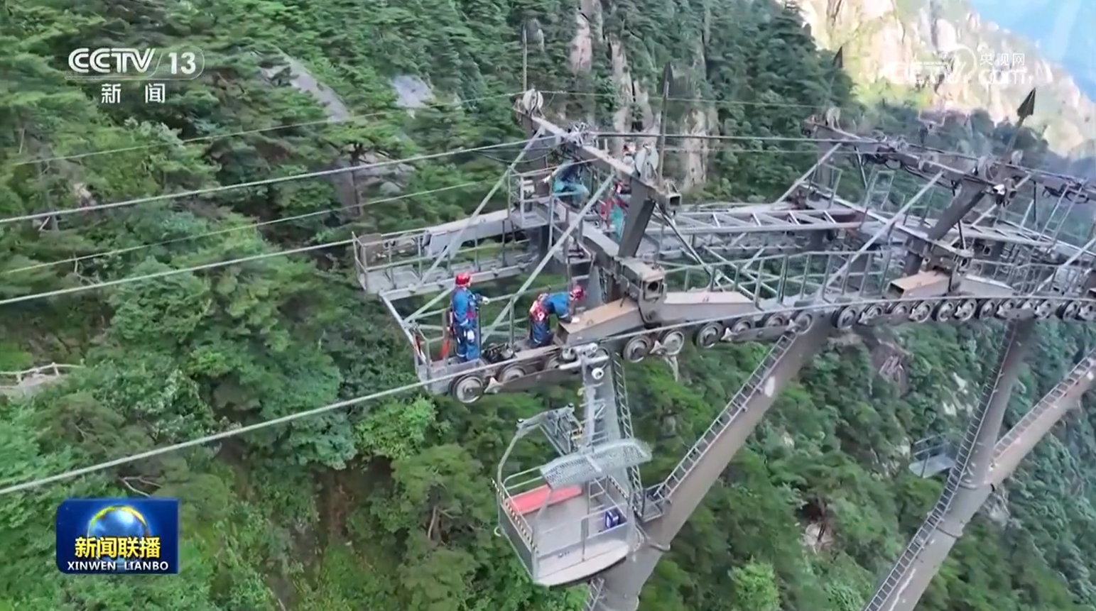 在黄山风景区,索道检修工不间断巡视云端索道,确保索道运行正常?;肺拦と巳痹诟?,投入到各路段和悬崖外围保洁工作。